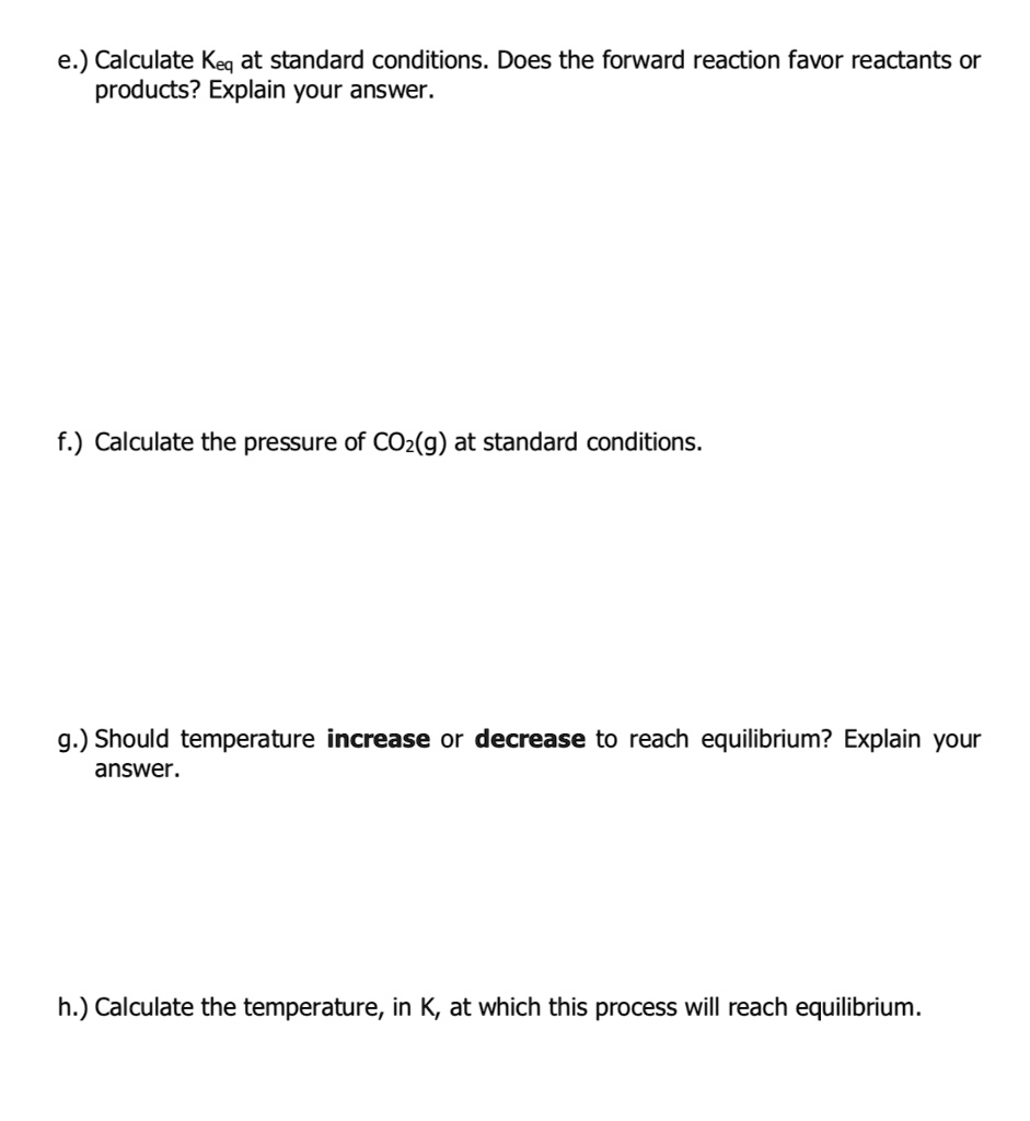Solved E Calculate Keq At Standard Conditions Does The Forward Reaction Favor Reactants Or Products Explain Your Answer F Calculate The Pressure Of Coz G At Standard Conditions G Should Temperature Increase Or Decrease